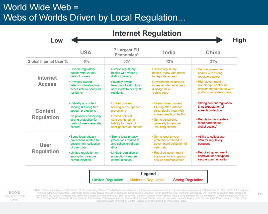 Кажется, в этом году впервые поднимается вопрос о регулировании интернета. С этой точки зрения интернет является не одной глобальной сетью (world wide web), а набором сетей с различным регулированием (слайд №191):