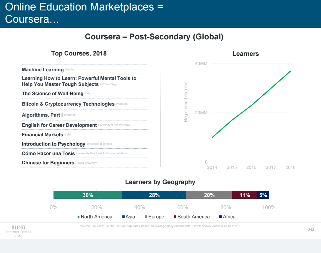 Количество обучающихся на сайте Coursera практически линейно растёт с 2014 года и сейчас там зарегистрировано почти 4 миллионов человек. Топ самых популярных курсов немного изменился с прошлого кода: на первом месте остался курс “Machine Learning” от Стенфорда, на второе место вышел курс “Learning How to Learn” (был на третьем месте в прошлом году), а на третьем появился “The Science of Well-Being” (в прошлом году его не было в десятке). Из топ-10 пропал курс “Neural Networks / Machine Learning”, который был там в прошлом году.