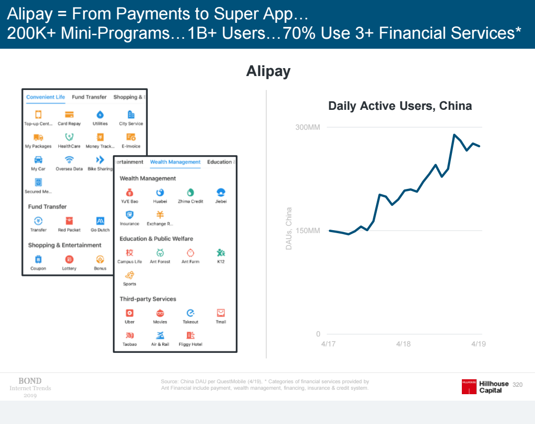 AliPay превращается в экосистему для мини-приложений, связанных с платежами. Сейчас у них больше 1 миллиарда пользователей и DAU ~ 300 миллионов человек (слайд №320):