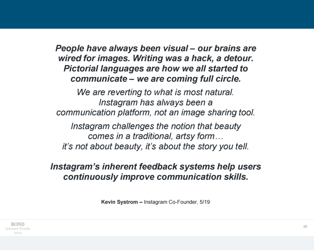 В июне 2019 года на конференции Code в штате Аризона Мэри Микер представила новую версию своего ежегодного отчёта Internet Trends. Ранее я уже публиковал обзор на отчёт 2018 года, а теперь получилось прочитать и проанализировать текущий. В этом обзоре я кратко опишу те вещи, которые показались мне особенно важными.